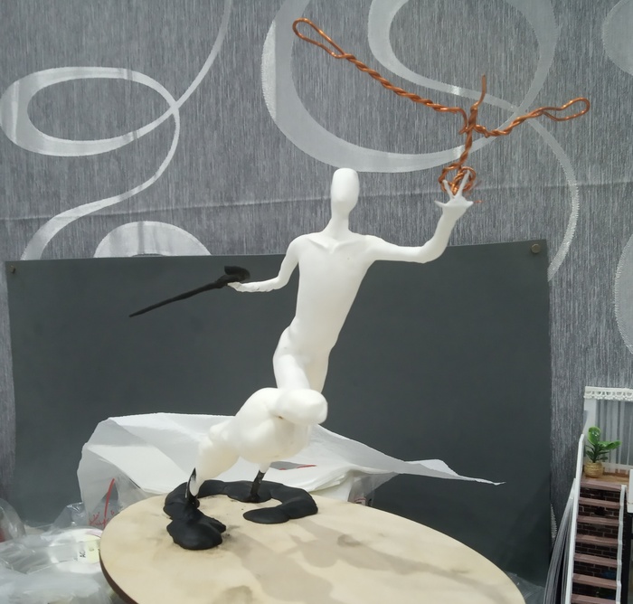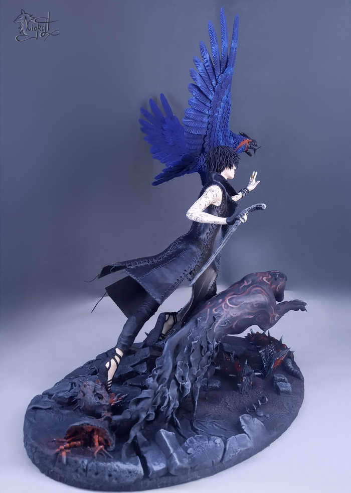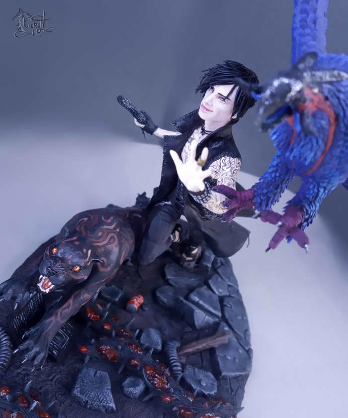 Вся композиция выполнена из бархатного пластика. К самозатвердевающей массе пришлось прибегнуть только для создания трости Ви и когтей Тени. Журнал из бумаги. Корни Клипота созданы с участием лака и витражных красок. Подставка - фанера.