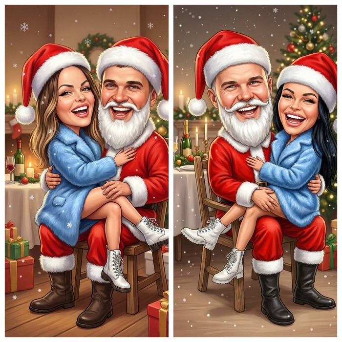 Не добавляй новых людей и не убирай существующих, в кадре ровно 2 персонажа. Сделай яркую новогоднюю карикатурную иллюстрацию с крупными головами и слегка преувеличенными эмоциями, но лица должны оставаться похожими на референсы. Сцена: мужчина в образе Санты сидит на деревянном стуле и держит женщину на руках, женщина сидит поперёк его колен, оба громко смеются и смотрят в камеру, максимально весёлое настроение.