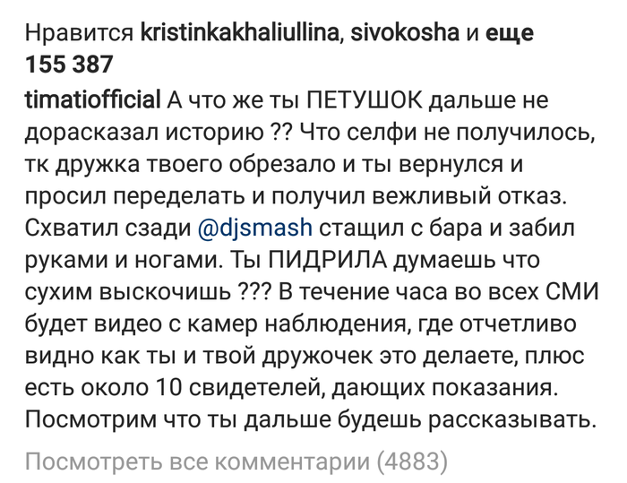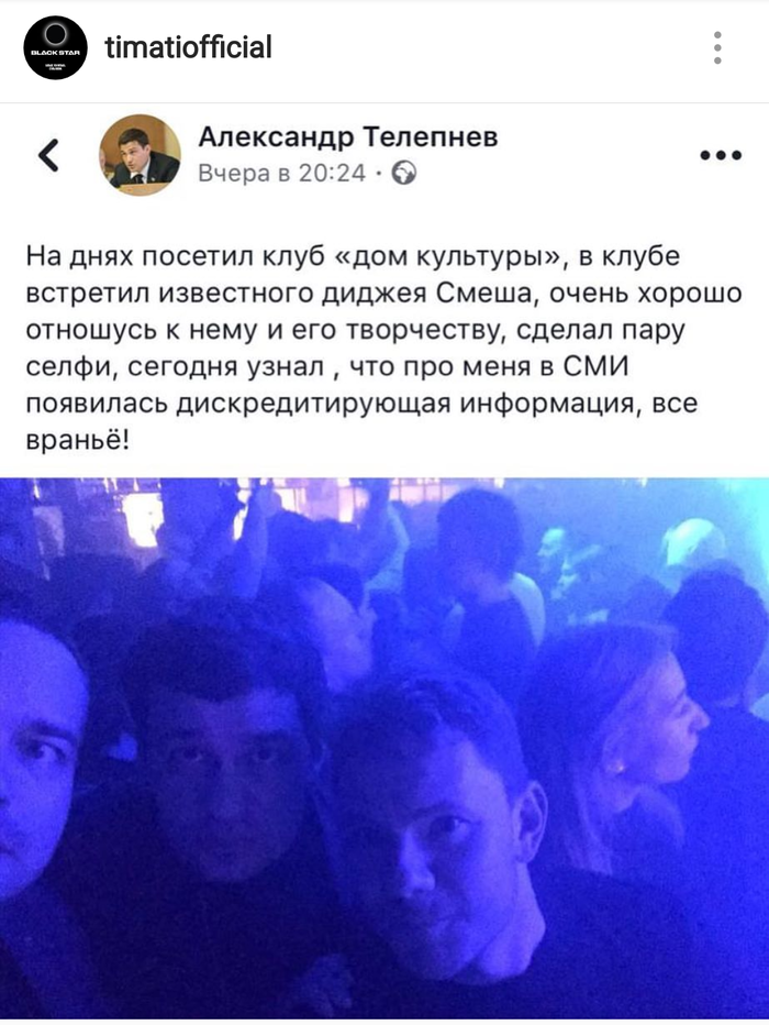 Телепнев отреагировал на сообщения СМИ постом в Facebook. Он выложил совместное фото с «известным диджеем Смешем», назвав информацию о драке враньем.