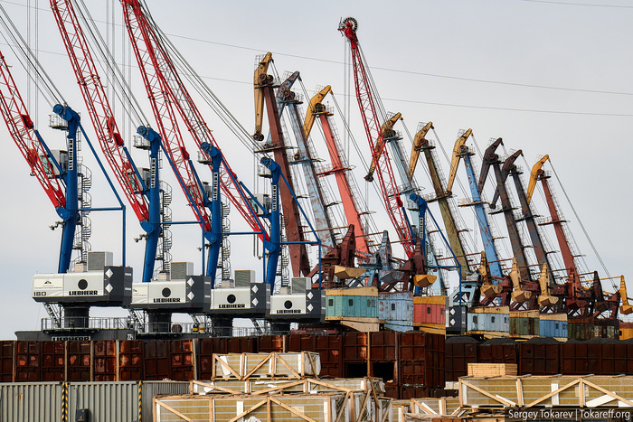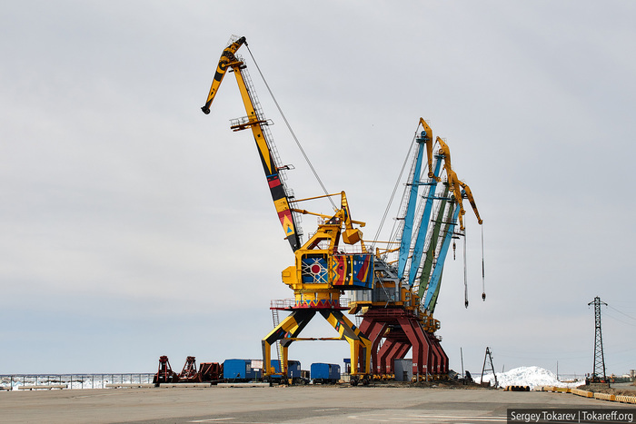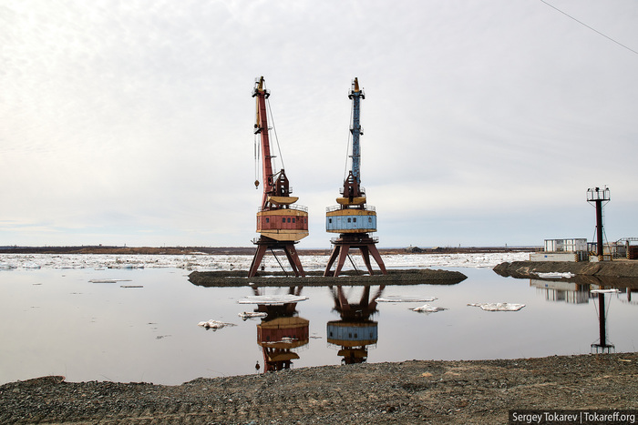 Каждую весну порт топит. В мае уровень Енисея поднимается и пристань уходит под воду. На время затопления краны поднимают на верхний ярус, а после паводка спускают обратно.