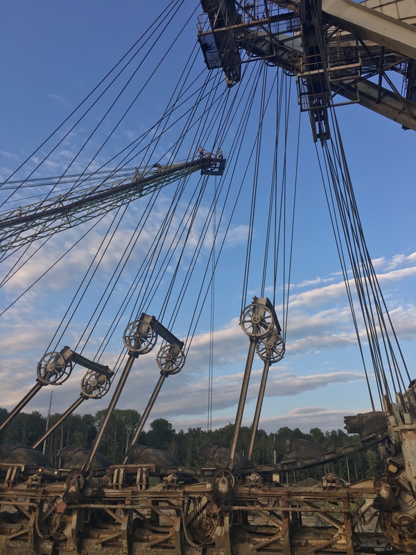 Припарковавшись на обочине взяли все свои вещи и пошли пешком по жд путям опять же в направлении координат Абзетцера по Яндекс-картам :) Идти пришлось около получаса, до самого Абзетцера, но уже через десять минут ходьбы из-за леса показалась эта махина загружающая вагоны. Сказать что мы такого никогда не видели - ничего не сказать... Как бы это не звучало, но такие вещи нужно видеть своими глазами! Добравшись до места мы и поснимали то что хотели для проекта и побывали в самой кабине, и на стреле соседствующего с Абзетцером огромного экскаватора. Все удовольствие стоило нам 150р с человека. Особо удачливым даже давали запустить махину и немного под бдительным руководством по-управлять...