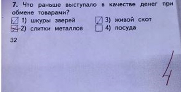 Читаю и мягко охреневаю, так как понимаю, что в принципе учебник достаточно уверенно подтверждает версию о том, что металлические слитки раньше выступали в качестве денег. Сообщаю ребенку, что по моему мнению, ответила она корректно и беру паузу на выяснение обстоятельств. Для начала решил пообщаться с учительницей - связался с ней через мессенджер. Дискуссия, которая началась по началу оживленно через некоторое время затухла, когда преподаватель поняла, что ничего по сути сказать она не может кроме того, что "в сборнике тестов в качестве правильных ответов указаны только ответ 1 и 3" и все вопросы к издательству (а то, что это не соответствует ни учебнику, ни реальности – так это уже дело десятое). Ну раз сказали «издательство» значит издательство. Нахожу и покупаю этот сборник тестов, чтобы иметь возможность ознакомиться с данным шедевром лично.