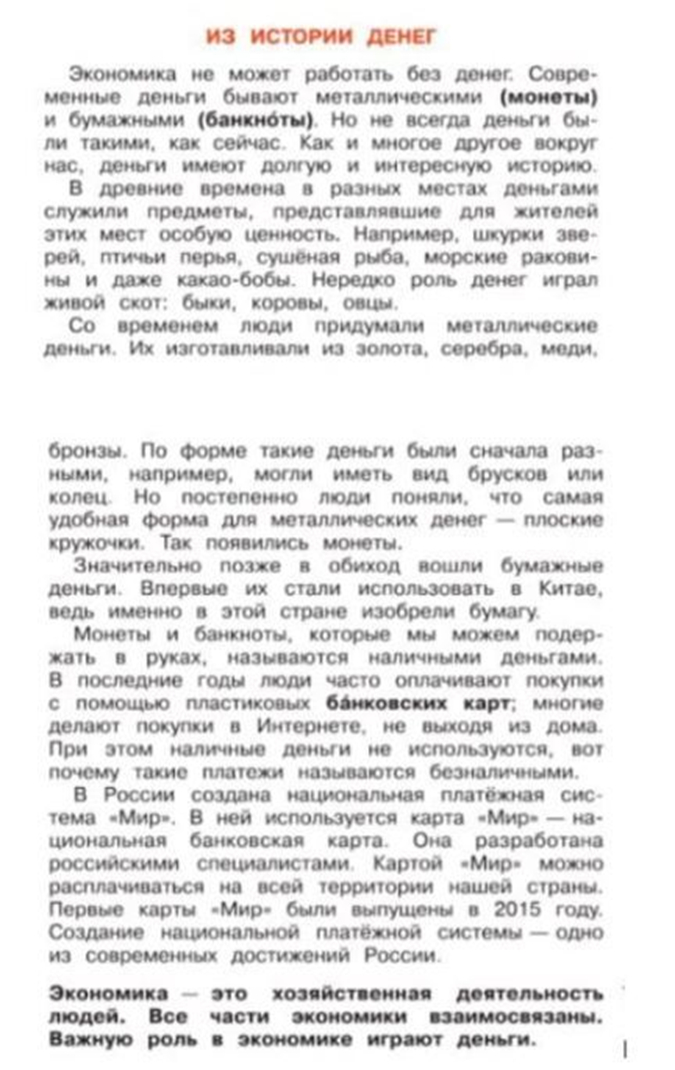 Есть у наших детишек замечательный предмет - "Окружающий мир". Наш класс обучается по учебнику А.А. Плешакова. Время от времени по итогам раздела проводятся проверочные работы в виде тестов. При подготовке к ним, я обычно прохожусь с дочерью по разделу учебника для того, чтобы освежить ее знания. И вот наступает момент, когда детки доходят до раздела "Что такое экономика". Вроде ничего сложного - прогоняем все как обычно. По пути немного углубляемся в вопрос древних денег - показываю дочке изображения того, как выглядели деньги раньше, еще чуток глубже рассказываю про безналичные платежи. Вижу, что понимание есть и спокойно завершаю процесс.