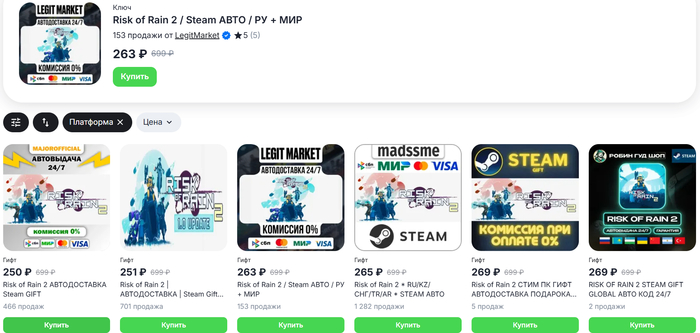 Переходим в категорию «Risk of Rain 2» и выбираем подходящий товар. Также, как и в предыдущем способе, смотрим на его критерии, внимательно читаем описание и оплачиваем.