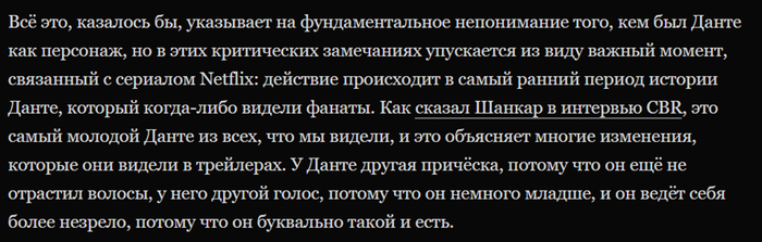 Возвращаясь к теме бедных демонов. Я просто напоминаю что во франшизе DMC демоны и ад за небольшими исключениями были списаны с того как описывал ад Данте Алигьери. Т.е. место пребывания и отбывания наказания душ грешников. И фишка была в том что только лишь некоторые демоны имели остатки человечности и разума близкого к людскому. Почему было это так не оставить? Потому что Ади Шанкар и Нетфликс не могли пройти мимо темы притеснения и засунули их в тайтл самым тупым и ленивым из возможных способов.