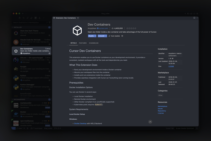 Использую: Dev Container. Это способ запускать окружение разработки внутри Docker-контейнера. VS Code (или Cursor) подключается к нему, и ты работаешь как обычно. Только изолированно от хост-системы.