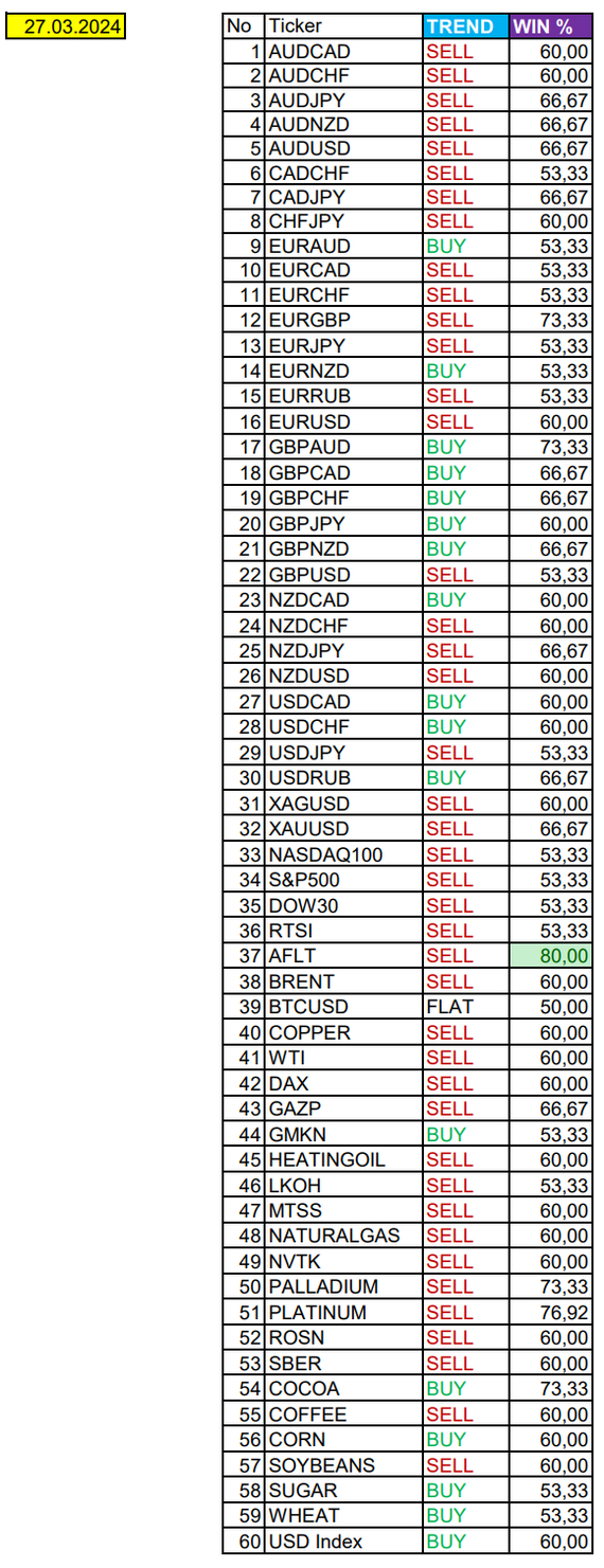 Очередные сезонные тенденции на Среду 27 Марта 2024 по основным мажорам финансовых рынков.