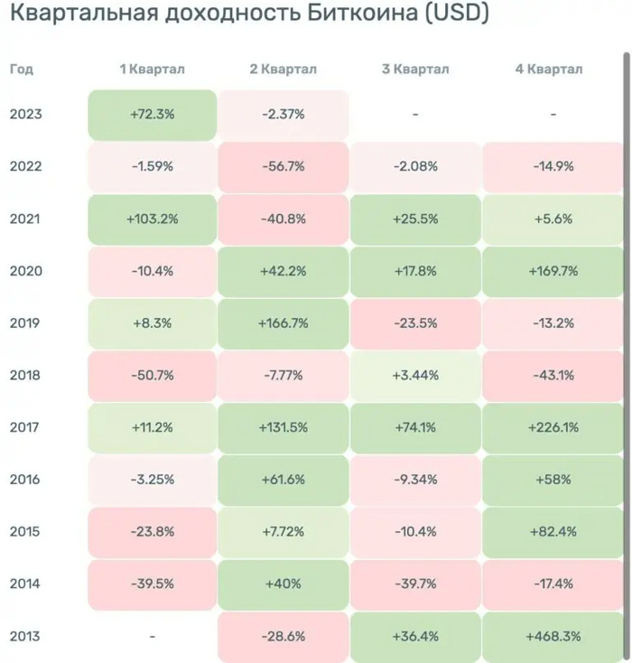 Доходность BTC по кварталам с 2013 по 2023 год. Источник - Incrypted.