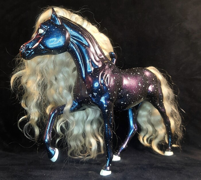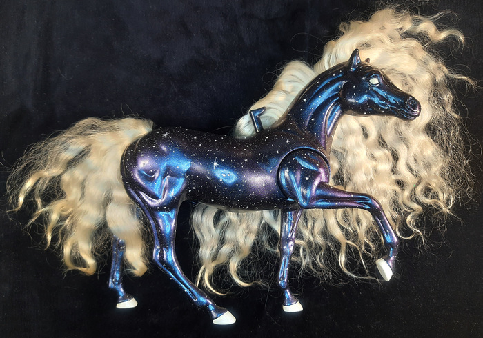 Перекрашен - цвет меняется от угла освещения (фиолетовый/голубой), звёзды на корпусе флуоресцентные (светятся в темноте). Грива с хвостом прошиты натуральной козьей шерстью. При нажатии на кнопку в спине опускает копыто. Последнее фото - до преображения.