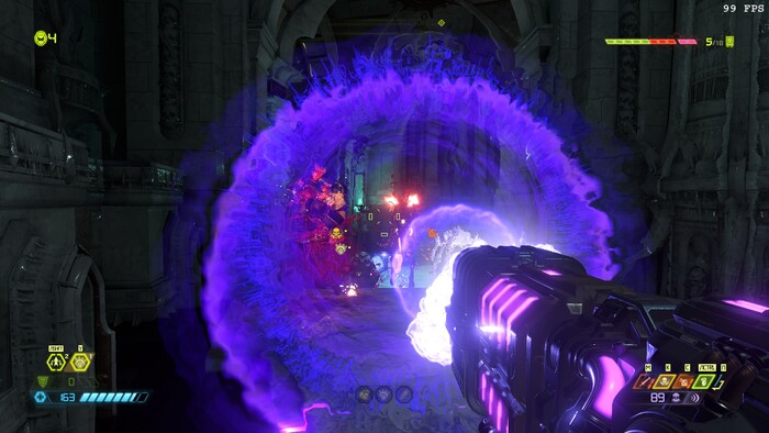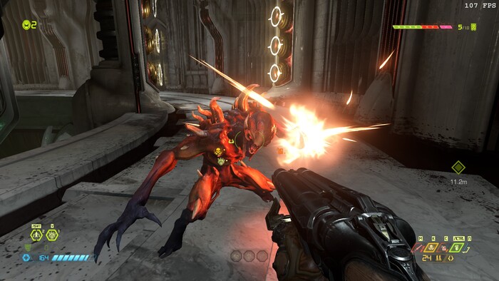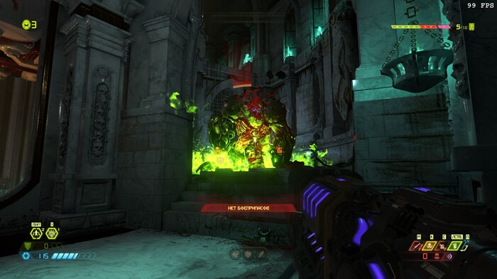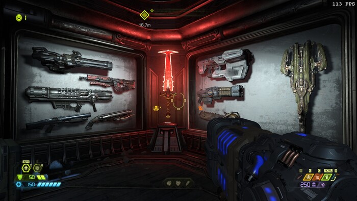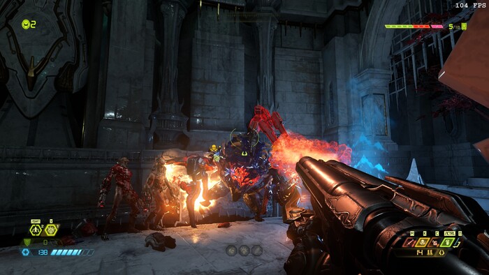 Не плохой арсенал у гг, спец эффекты в игре на высоте, игра не очень реалистичная что делает её приятной и не тошнотной но я решил выключить мигающие подсказки для зверских убийств уж очень раздражают и отвлекают и я решил выключить глубокие тени отражения и сглаживание пикселей консольной командой r_antialiasing 0 короче всю лабуду отключил, а вот качество объектов выкрутил на ультра кошмар ну вы знаете углы на 3д моделях, а вот качество частиц решил выкрутить на ультра кошмар так как они мне нравятся, отражения в игре выключил толку от них нету и они мне не нравятся и я поставил качество объёмных эффектов тоже на низкие настройки также и качество освещение тоже на низкие настройки, я не любитель красивой графики даже если у меня мощный комп я всё равно решил поберечь комп от нагрузок да и вообще смысл какой выкручивать всё на ультра так как это никак не влияет на игровой процесс и нагружает комп, а теперь немного о цветном интерфейсе в игре, цветной интерфейс в игре и боеприпасы выпадающие из врагов очень хорошо дают сориентироваться где что и сколько выпало в отличии от doom 2016 где боеприпасы одноцветные да игра тоже неплохая но она мне не очень понравилась из за её мрачности и темноты ну такое себе.