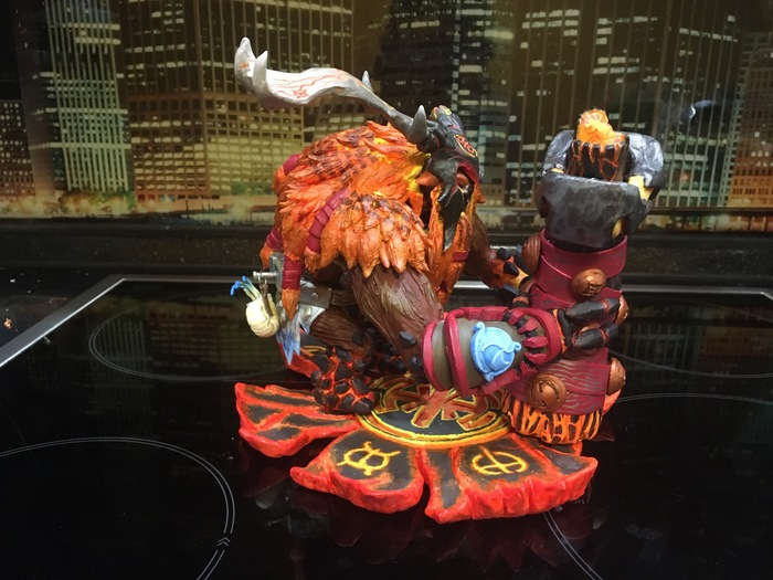 Известно, что существует несколько природных явлений на которые можно смотреть бесконечно. И одно из них это пламя огня. И именно это пламя, живое и трепещущее запечатлено в оправе моего нового творения - Earthshaker Mod Arcana "Planetfall". Шапероны этого парня работают 24/7. А в обсидиановых конечностях пульсирует расплавленная лава. Одного взгляда на него достаточно, чтобы на душе стало немного теплее. На этот раз я как следует заморячился. Огромный молот, молотовище которого изменяет форму во всех плоскостях, пышная шевелюра , которой позавидует даже Анджела Дэвис и подставка, столь реалистично имитирующая разверзшуюся магмой твердь, что боишься ожечь о неё руки. Целый месяц терзания материи и он наконец-то готов.