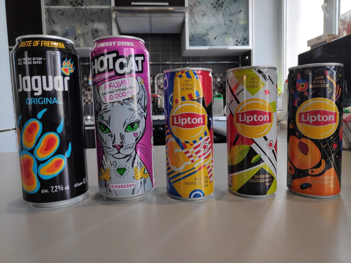 А здесь по остаточному принципу собрались баночки, которые просто так или иначе привлекли моё внимание. Тут и ностальгическая алкогольная Яга (Блейзер и Виноградный день брать не рискнул, уж извините), и какой-то энергетик с клёвым принтом сфинкса (обожаю сфинксов) и до сих пор продающаяся очень здоровская авангардистская серия Липтона.