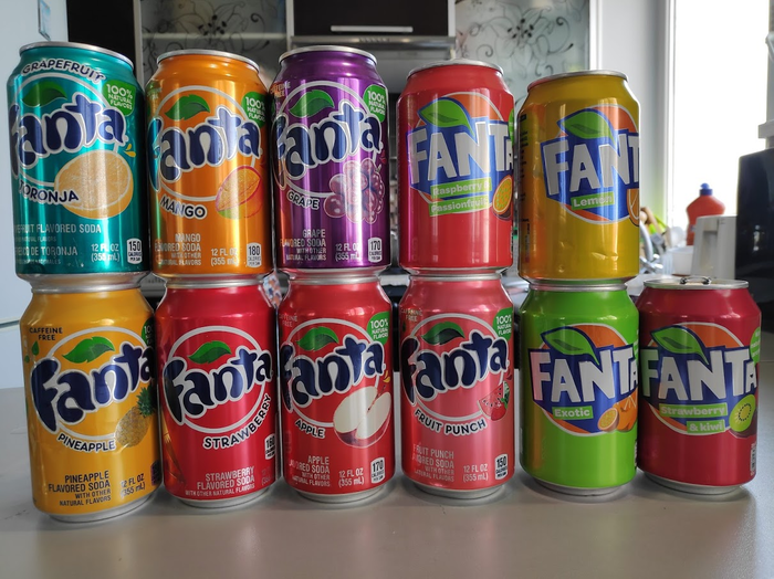 В отличие от Фанты, где корпорация отводила душу как только могла. Мне удалось собрать 11 разных вкусов и я очень сильно сомневаюсь, что это полный ассортимент - даже если не брать в расчёт безумный японский рынок, есть ещё, например, греческая негазированная Orange Blue или недавно появившаяся на наших прилавках румынская Shokata со вкусом лимона и бузины. Кстати, с какого-то перепугу на островках в наших торговых центрах это всё добро продаётся по 100-120 рублей за банку, хотя их нормальная цена не больше 90 центов.