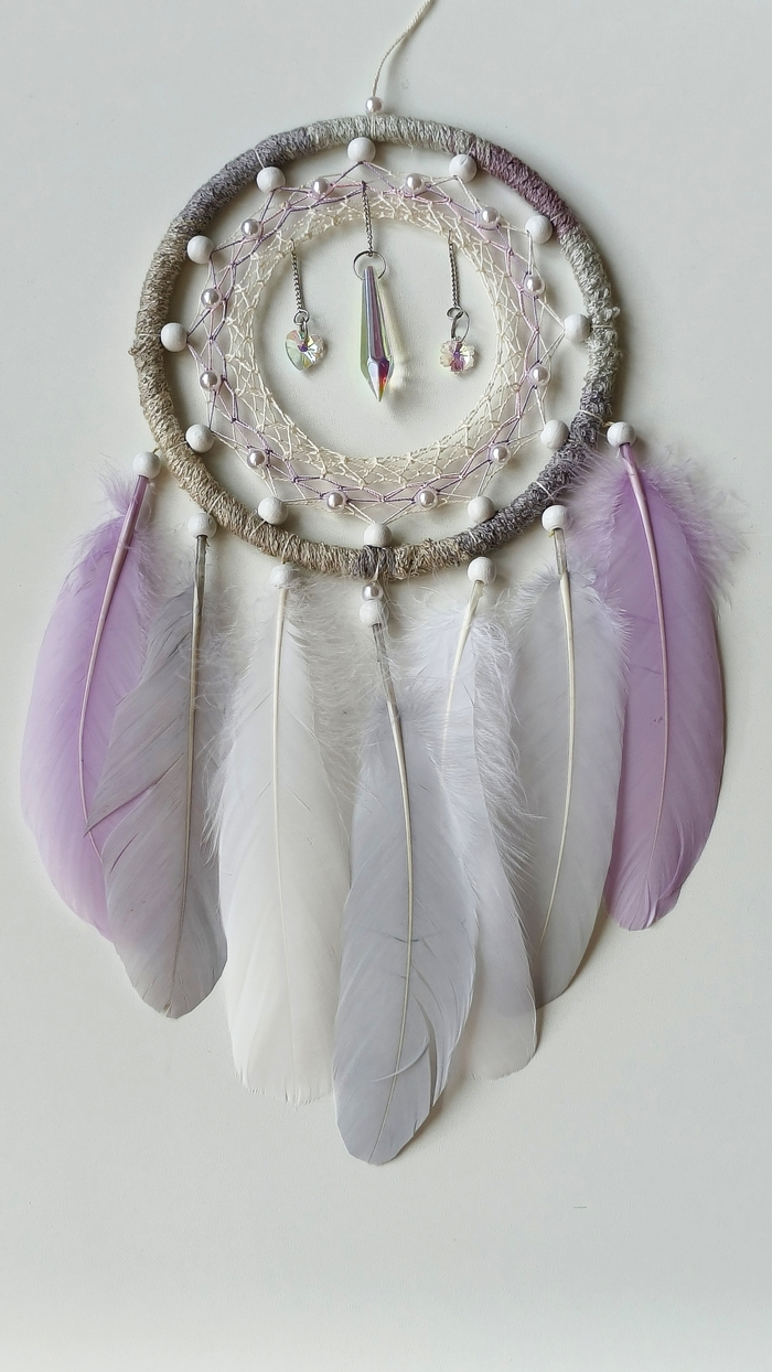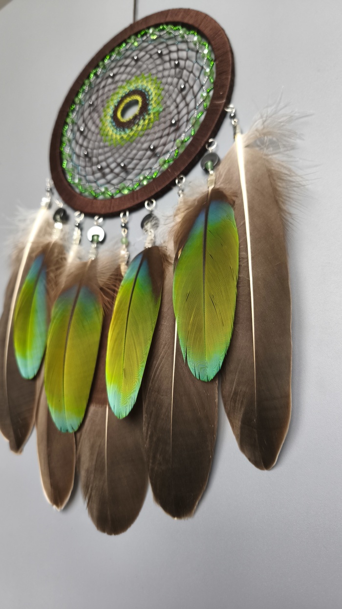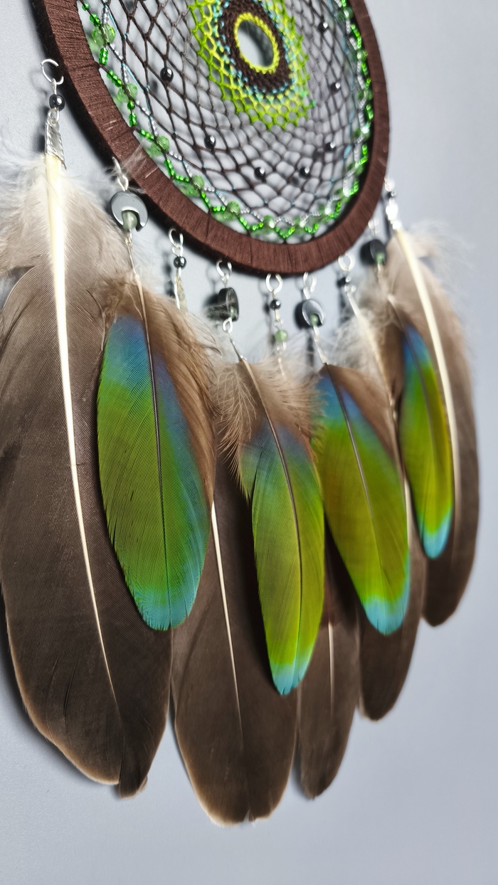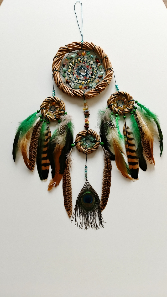 Ловец по желанию заказчицы был выполнен без перьев Вместо них — пышных хвост из нитей разной фактуры, а так же подвесов из бисера, минералов, стекла и перламутра