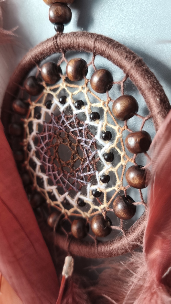 На самом деле делала я его таким не специально) я просто подбирала цвет ниток под перья, а вышло вот как в итоге) кстати перья тут очень красивые - это гусь и попугай ара, который меняет свой оттенок в зависимости от освещения. А ещё нашла у себя бусины из гематита в форме полумесяцев, и они тоже хорошо вписались в этот ловец)