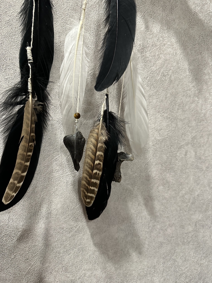 На основном кольце имеется надпись, которую можно знать только заказчику) помимо этого, в ловце россыпь бусин и бисера, а перья подобраны в цвет плетения