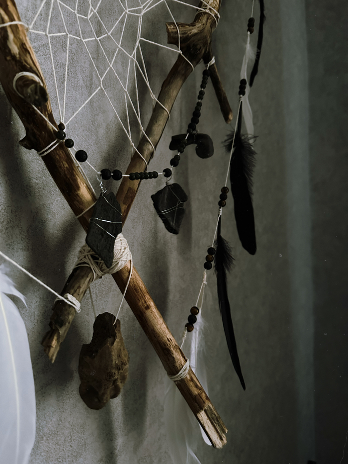 Ловец снов Самайн с обсидианом, чёрным агатом, тигровым глазом, вулканическим камнем и дымчатым кварцем.