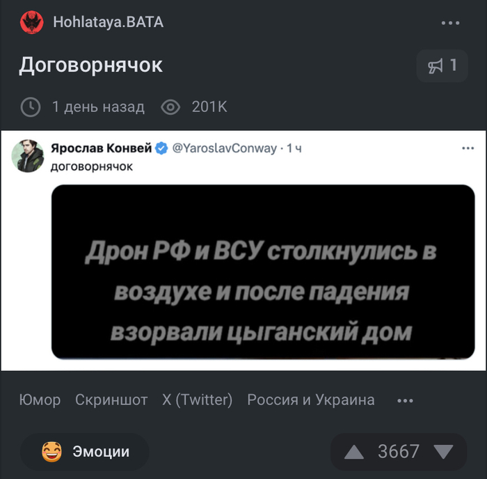 Летит российский дрон, навстречу ему украинский. Российский говорит украинскому: –Водку будешь? Украинский отвечает: –Буду! Выпили... Украинский русскому говорит: –А горилки хочешь? Русский говорит: –Хочу! Выпили. И так три раза... Настроение поднялось, веселятся! И тут им приходит идея: "Ай-да, махнём к цыганам!"