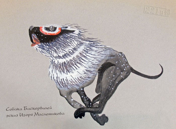 ""В подборе на эту роль нельзя было ошибиться — только появлением настоящего монстра в кадре получилось бы объяснить страх и ужас обитателей Баскервиль-холла, — рассказал Виктор Оковитый, художник комбинированных съемок. — Четвероногих претендентов отсмотрели нескольких. Методом проб и ошибок искали типаж — никто же не знал, как именно должна выглядеть собака в конечном итоге. Перепробовали псов разных пород, предлагали даже пекинеса с выцарапанным кошкой глазом, второй глаз при этом смотрелся очень безумно. Мы отсняли с ним несколько дублей, но результатом остались не удовлетворены. Придумали снимать в роли собаки Баскервилей телёнка, но быстро отказались и от этой затеи. Потом был вариант с догом. Его облепили светоотражающей лентой, которую клеят на дорожные знаки. Наклеили скелет собаки на животное и стали снимать на черном бархате. Посмотрели отснятые куски и расхохотались — получился просто "бегающий скелет".