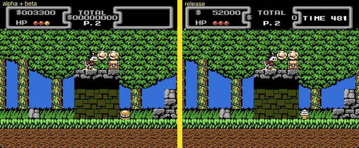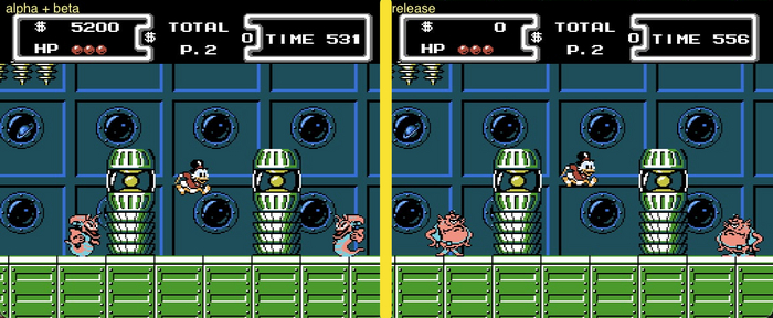 7. Взаимодействие с братьями Гавс. Как видно на скриншотах, с ними всё было сложно. Сперва Скрудж вообще никак с ними не мог столкнуться или убить их. В бета-версии он уже мог их побеждать как обычных врагов, но они не могли нанести урон Скруджу (можно было просто запрыгнуть на него и стоять). И лишь в финальной версии Гавсы ведут себя точно так же, как и все другие противники.