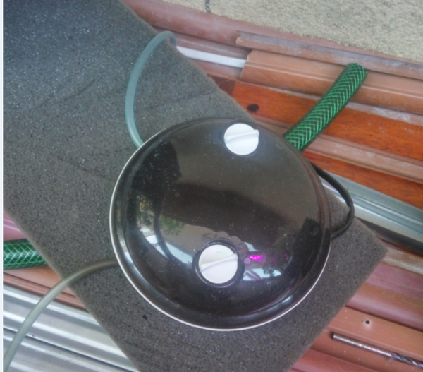 2) Сделали уровень раствора, я просверлил дырку внизу, вставил шланг от компрессора, залил все герметиком, отметил уровни максимума и минимума.