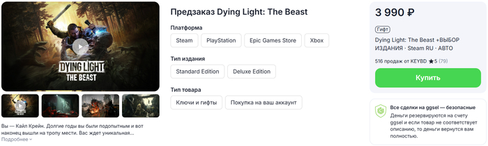 1. Переходим в категорию «Dying Light The Beast» и выбираем подходящий товар. Также, как и в предыдущем способе, смотрим на его критерии, внимательно читаем описание и оплачиваем.
