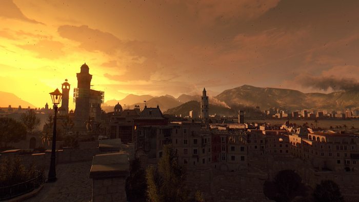 - во-вторых, игрок часто находится на крышах зданий, с которых хорошо просматривается город, здесь важно создать правдоподобную панораму с точками притяжения и с ощущением масштаба города. Плюс панорама Старой части Харрана всегда выглядит красиво, особенно на закате;