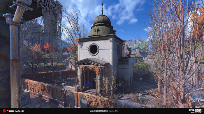 Все религиозные здания выполнены в двух архитектурных стилях – готический и классицизм. По факту на весь Вилледор для церквей и соборов дизайнеры игры сделали всего две модельки, которые отличаются только лишь цветом, либо наличием двух или одной башен в случае готических зданий. Данное решение не является удачным для дизайна внутриигрового города. Во-первых, город становится однообразным и неинтересным, по нему скучно перемещаться. Во-вторых, исключается аспект эстетического наслаждения городом, так как однотипные сооружения не способны вызвать желание у игрока рассматривать архитектуру. В-третьих, такой подход исключает наличие истории города, которая может считываться по архитектуре. В Dying Light 2 ситуация усугубляется еще и тем, что механика паркура подразумевает то, что игрок невольно обращает внимание на здание и внимательно осматривает с целью понять, как на него забраться, особенно если это выделяющийся на фоне общегородского пейзажа большой собор, играющий роль лэндмарка. А забравшись на это здание, рассматривая панораму города, которая в случае Вилледора как и в исторической, так и в новой части не наполнена интересными достопримечательностями, игрок не будет чувствовать ничего кроме разочарования.