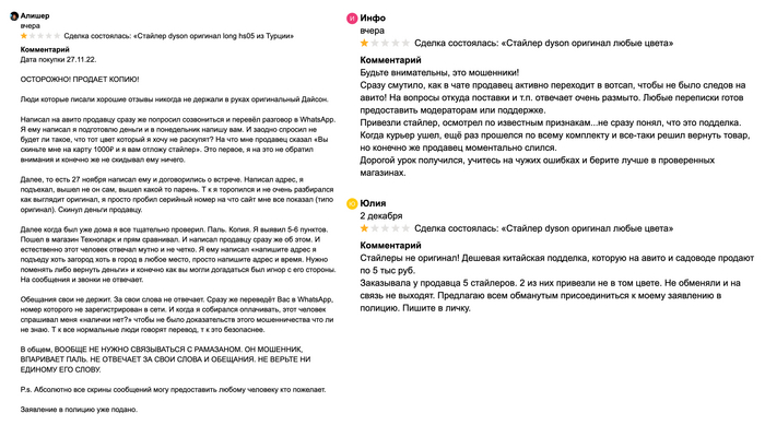 В общем, с прошлого дня рождения моей девушки, когда я не особо озаботился подарком, а просто скинулся с ее друзьями на недорогой увлажнитель, а она мне подарила айпад про и прикольный рюкзак Calvin Klein, она всегда немного грустит, когда включает увлажнитель. И в этот раз я решил не оплошать и стал искать преславутый дайсон. Сейчас я уже, конечно, настолько осведомлен в этой сфере, что знаю каждый болтик и сколько зубчиков у насадок этого стайлера, но тогда я просто хотел заплатить поменьше денег и получить побольше восторгов при вручении подарка. Я исследовал стандартные магазины электроники, в Мвидео, технопарке цена на новую модель была 80-90 тысяч и хоть я и понимаю преимущества дайсона: запатентованные технологии и наличие у всех подруг в инстаграме, цена превышала мой психологический лимит цен на фен) Да и так сказать красная (!) цена на него 9999 лир, т.е 33 тысячи. И я решил проверить, что предлагают на авито, мало ли кто-то возит их с наценкой менее 200% и конечно же я нашел. Страничек было несколько и я бы не обратил на них внимание, если бы не сотни и тысячи отзывов 5.0 у данных продавцов. Учитывая, что на авито, как мне казалось, заработать такое количество отзывов и не получить ни одной "1" от какого-нибудь сумасшедшего деда, который просто перепутал объявление, крайне сложно, я поверил в чистую репутацию продавцов. Цена за стайлер варьировалась от 40-45 тысяч, что все еще было не дешево, но уже и не стоимость айфона. Я написал одному из них, Рамазану (не уверен, что имя настоящее).