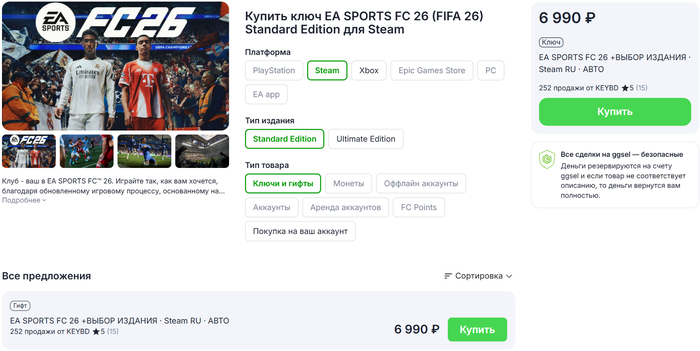 Переходим в категорию «FIFA 26» и выбираем подходящий товар. Также, как и в предыдущем способе, смотрим на его критерии, внимательно читаем описание и оплачиваем.