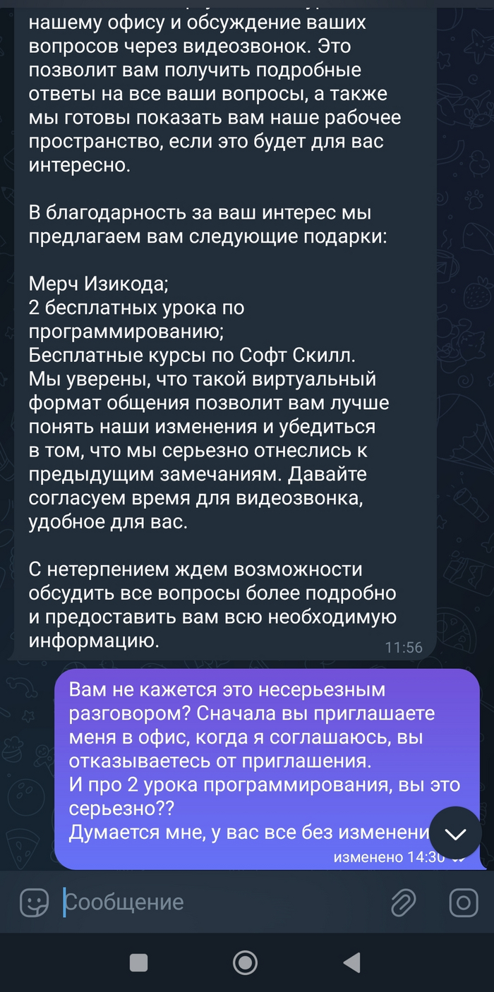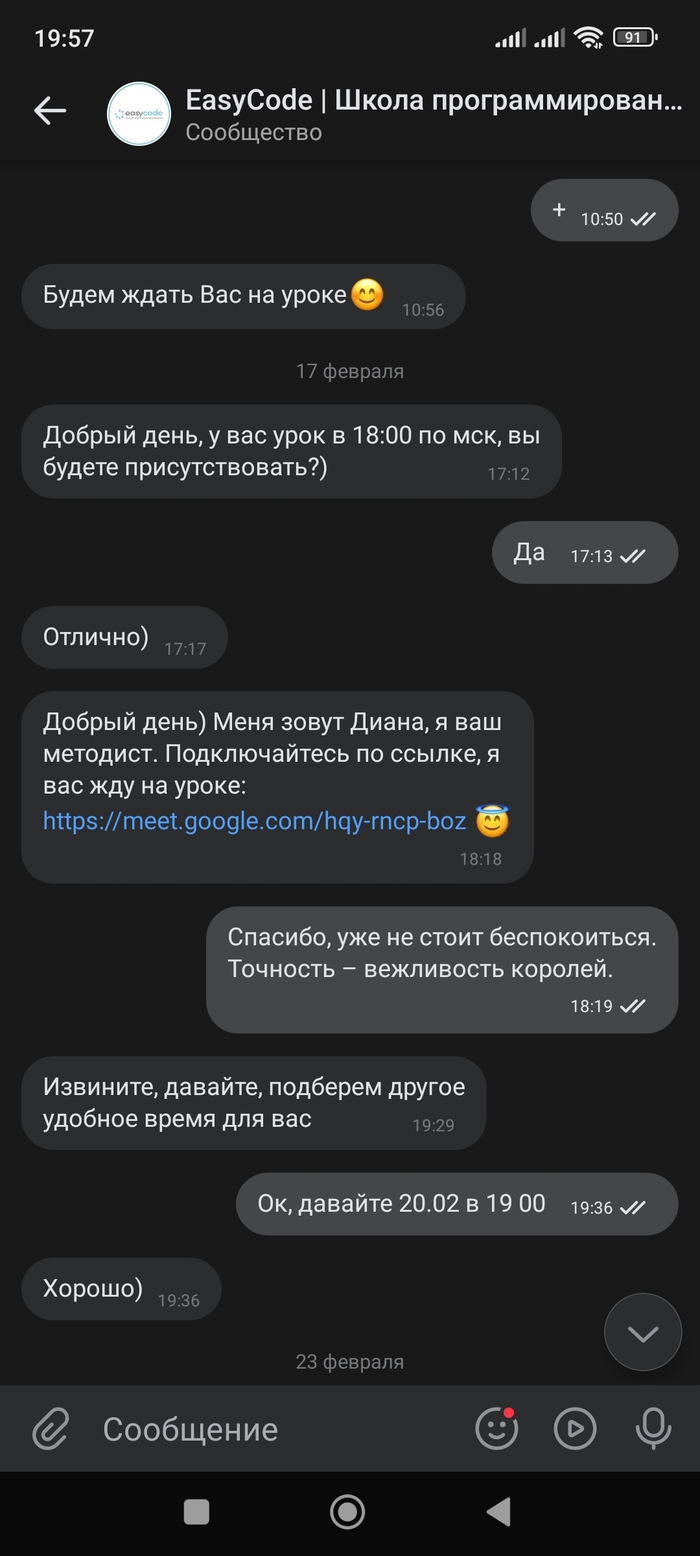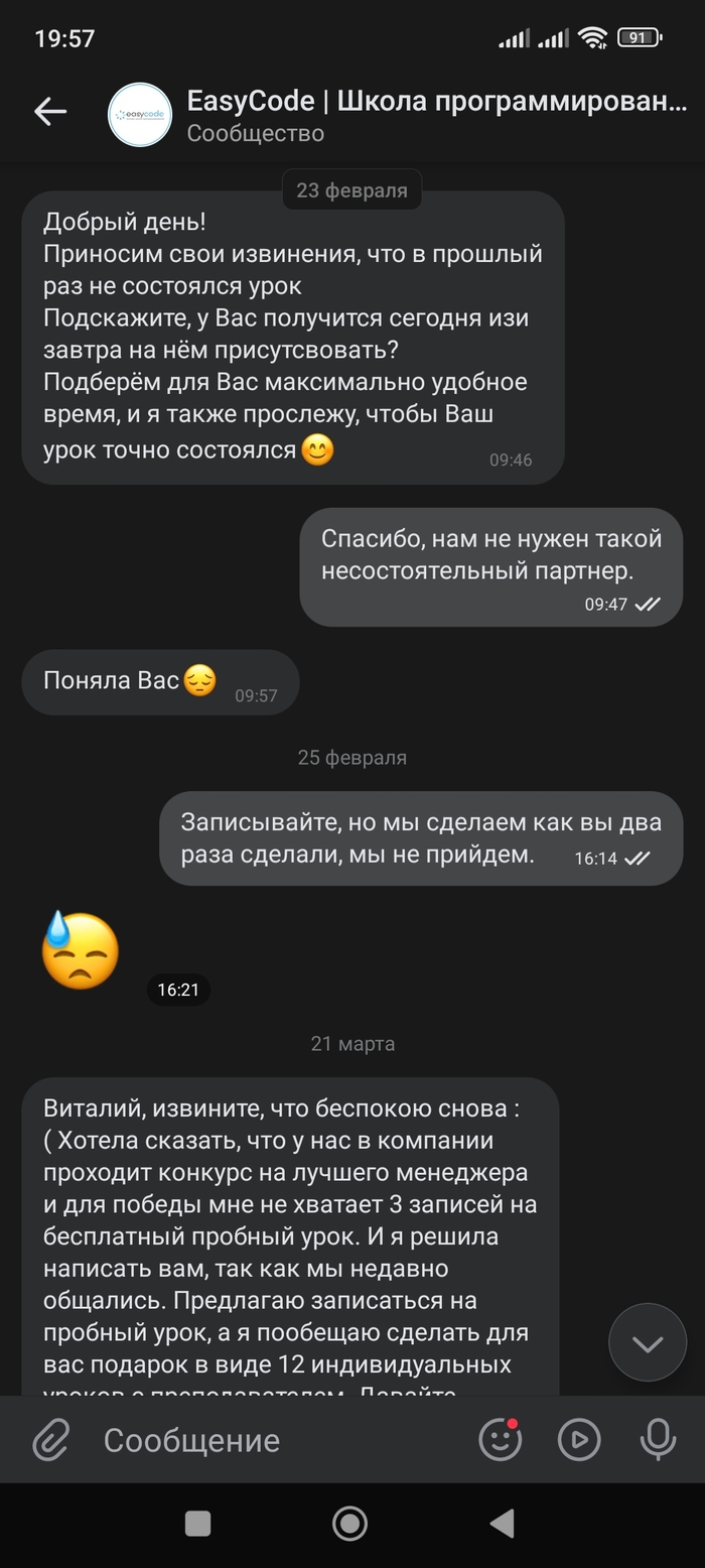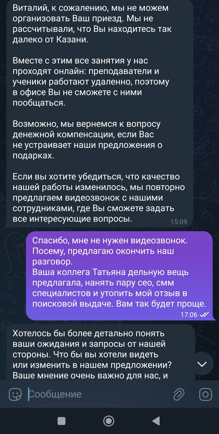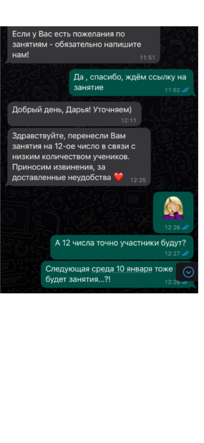 Оооо, жаль не увидела нелестные отзывы когда оплачивала занятия в этой школе….Начиналось все хорошо, провели пробный урок, выбрали удобное расписание, оплатили и начали ждать занятий! Через 2 недели началось: то предлагают группу по не подходящему времени , то дню, хотя варианты дней и времени были уже оговорены не раз. Через месяц занятия так и не начались. Когда заговорила о возврате денег-группа сразу нашлась. уде начали радоваться , но зря, перенос первого занятия был 3 раза , по неделе каждый! Каждый раз кормили завтраками. В общей сложности, через 2 месяца ожидания начала занятий нашли другую школу, ребенок начал заниматься. А у меня началась еще одна эпопея по возвращению своих денег! Написанного заявления со всеми чеками и реквизитами(как указано в договоре) не достаточно: сначала видео собеседование назначают (дня через 4-5) , на нем предлагают блага от подарочных занятий до заморозки скидки, если деньги не выводить…потом подарочное занятие высчитывают из всей суммы обучения за полгода и просят написать еще одно заявление в их бухгалтерию с указанием измененной суммы. И…тишина…через 2 дня -ровно 30 дней, в течение которых обязаны вернуть деньги, согласно договору. Жду, аж самой интересно. Но, ни менеджер , ни все чаты, которые до этого навязчиво атаковали уже на связь не выходят и на сообщения и вопросы не отвечают. Судя По тому как они себя ведут, возиться с ними еще долго … уже готовлюсь морально к гражданскому спору…