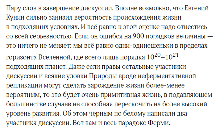Если другого пути, другого «входа» в мир живых из мира неживой материи не существует, то Кунин прав, и нам следует оставить надежду найти во Вселенной какую-либо жизнь, кроме земной. Можно предполагать, что всё начиналось не с одной-единственной высокоэффективной полимеразы, а, например, с некого содружества небольших, малоэффективных полимераз и лигаз (рибозимов, умеющих сшивать короткие молекулы РНК в более длинные): возможно, это сделает оценку чуть-чуть более оптимистичной, но принципиально ситуацию не изменит. Потому что всё равно первый репликатор был весьма сложным, а появиться он должен был без помощи дарвиновской эволюции — по сути случайно.