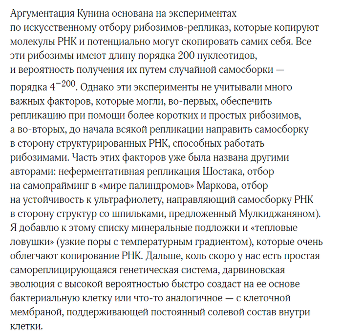 Всё это заслуживает дискуссии. Нет ли лазеек сквозь аргументацию Кунина? Не просматриваются ли какие-либо механизмы в обход «неупрощаемой сложности» репликатора РНК? Правда ли она такая уж неупрощаемая? И т. д.