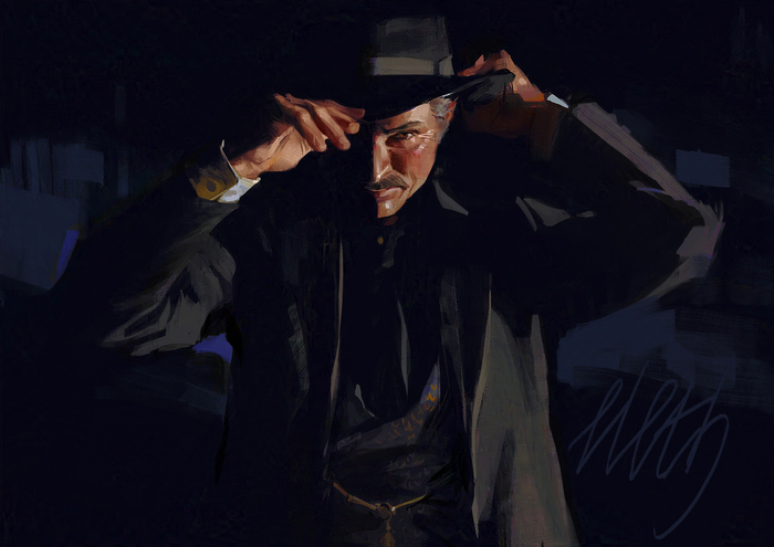 Забавно, что даже после просмотра четырёх фильмов с его участием мне в глаза не бросилось ничего подозрительного - и только в процессе рисования я поняла, что у дядечки отсутствует фаланга пальца (˃̣̣̥᷄⌓˂̣̣̥᷅♡)