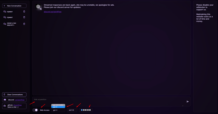 └ Внизу на сайте имеется возможность выбрать версию ChatGPT, после обновляем страницу. Хороший проект, работает стабильно и не требует регистрацию, открыли сайт и можете начать пользоваться, как по мне недооцененный проект с неплохой версткой, нигде про него не слышал - пробуйте.