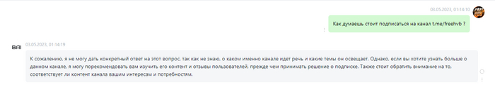└ Очень странно себя ведет, по всей видимости проект забросили, так как циклично выскакивают баги, то есть вроде бы бот отвечает, но мы не можем увидеть ответ из-за ошибок. Может быть у нас просто неправильно настроен браузер и мы не разобрались, как им пользоваться - попробуйте.