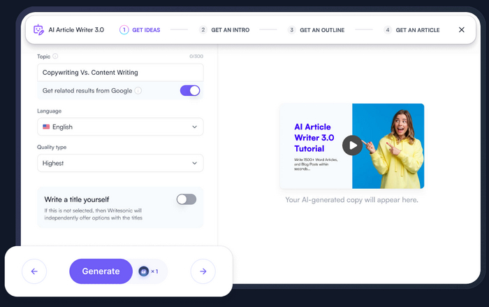 └ Требуется регистрация, временные почты не подходят, лимит 10 000 слов - бесплатно, дальше требует подписку, но вы можете создать новый аккаунт и пользоваться снова. Присутствует возможность генерировать описание к вашим товарам и в целом хороший помощник для вашего бизнеса.