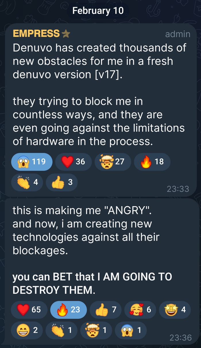 18 февраля хакер Empress в своей телеграм группе опубликовала сообщение о том, что бета версия кряка к игре совсем скоро появится.