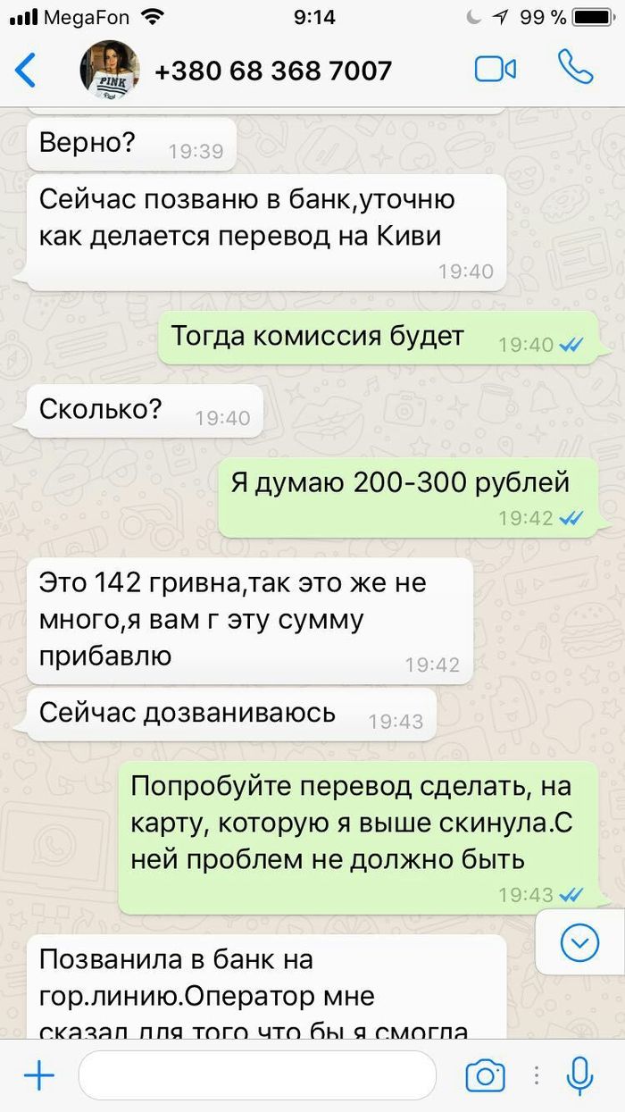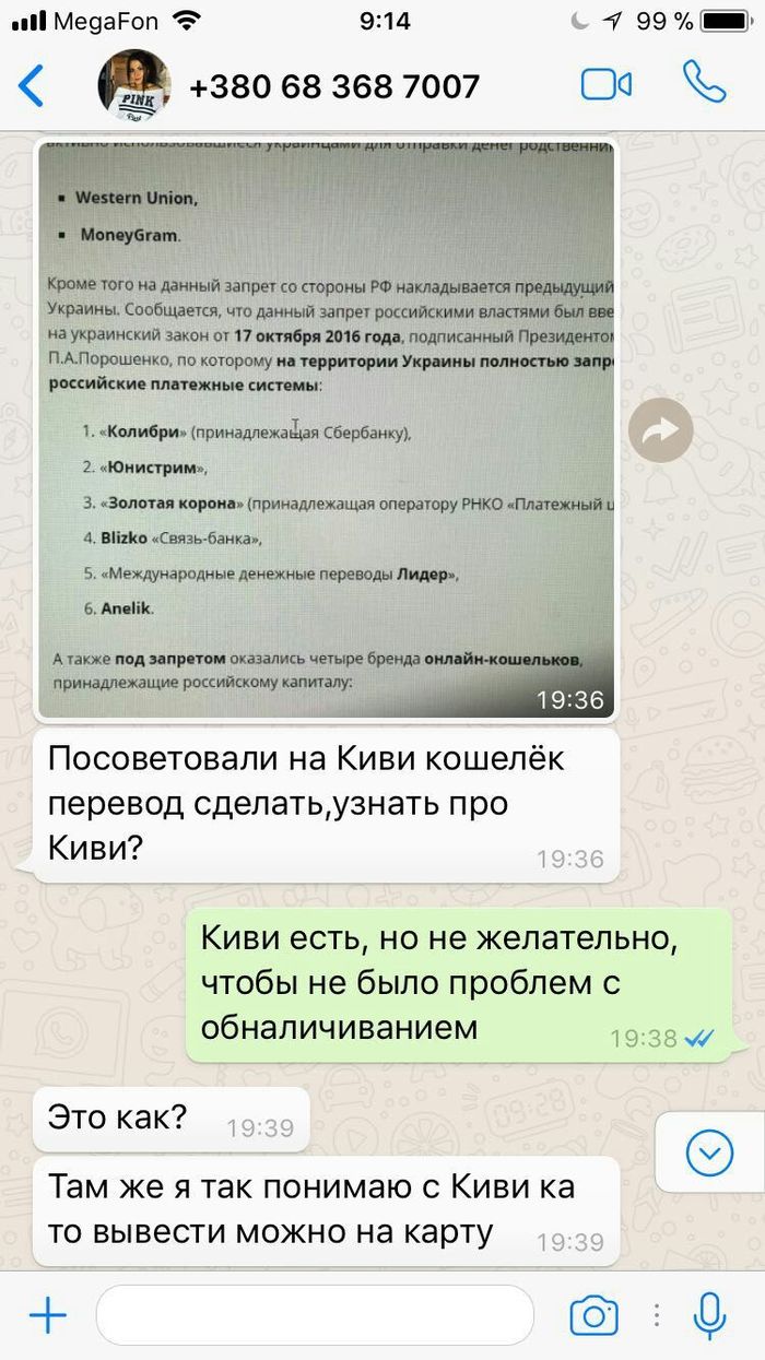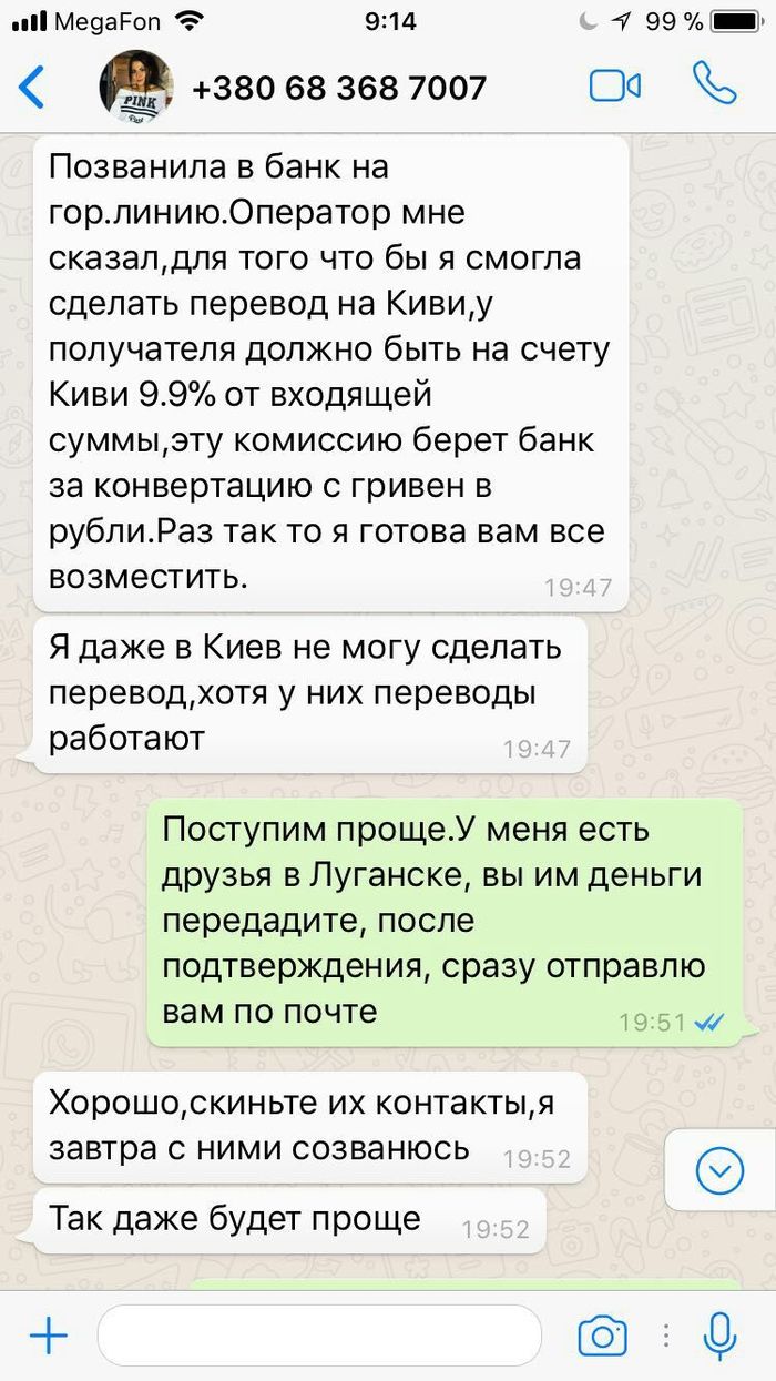 Связались с другом, который живёт в Луганске, он действительно подтвердил, что у них не работают сейчас переводы Western Union, Золотая Корона и т.д. Доля доверчивости немного восстановилась М 60% - П 40%. Но разводила тут же склоняет к Киви - излюбленный метод для мошенников: