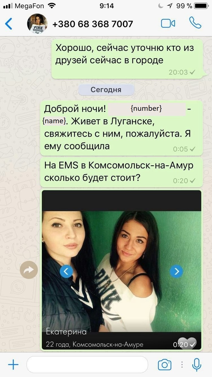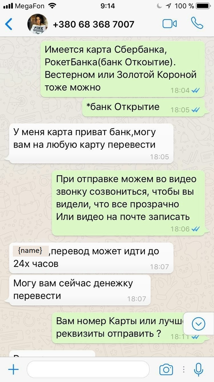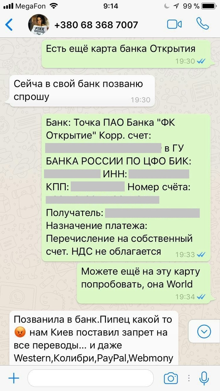 Последние мои сообщения отправились, но отсутствует информация о доставке, плюс пропала аватарка и статус собеседника. Поэкспериментировал в WhatsApp, такое бывает, когда тебя добавляют в черный список, т.е. мошенник потерял уже интерес ко мне.