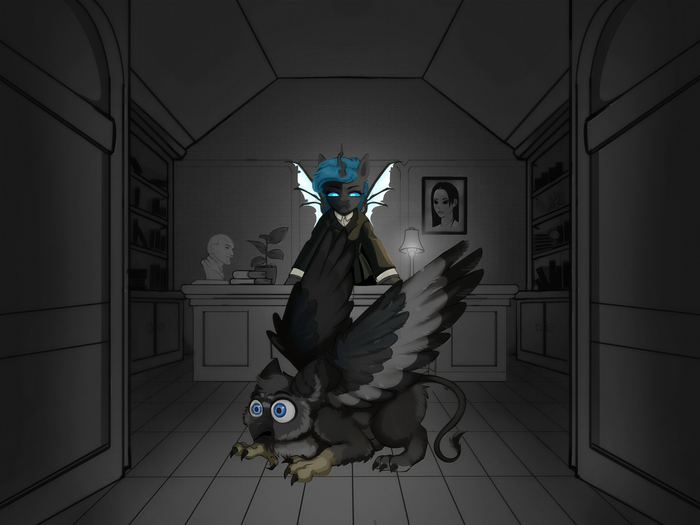 Тут,откуда невозмись - вспышка,зелёное зарево с фиолетовыми всполохами заполняет комнату,прежде чем исчезнуть,столь же быстро,сколь и появилось! И тут,на полу,появляется новый инопришелец.. Которым,как оказалось - был грифон. Он был в смятении. Только мгновение назад он был у себя,листал какой-то буклет или что-то в этом роде,а теперь весь его взор застилал угол помещения,чуждого,точно не его. Чейнжлинг,уже вскочившая с кресла,теперь нависала над столом,не сводя взора с развалившегося вторженца. Уголки её губ едва заметно поддёрнулись. Теперь она глядит на него с нескрываемой улыбкой и в этот же момент она осознает,что теперь не одна в этом мире безволосых обезьян. Теперь их двое,таких не похожих,но объединенных тем,что они из одной реальности. Наконец - она снова получает надежду. Наконец - она принимает на веру,что у неё всё таки есть шанс вернуться обратно. Нужно будет лишь приумножить попытки и забыть о старых неудачах,ещё раз.