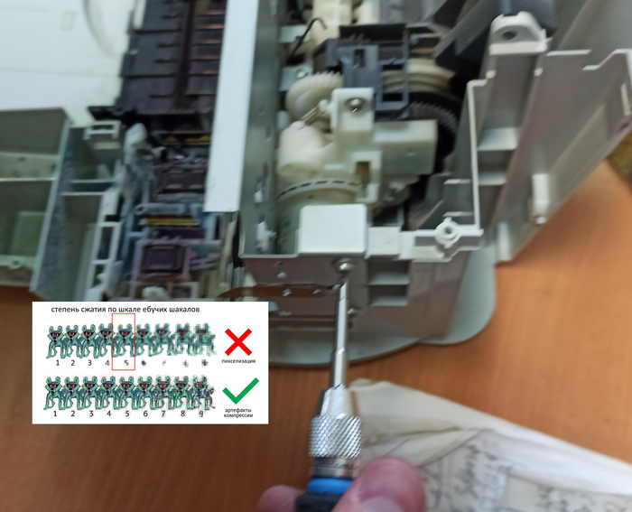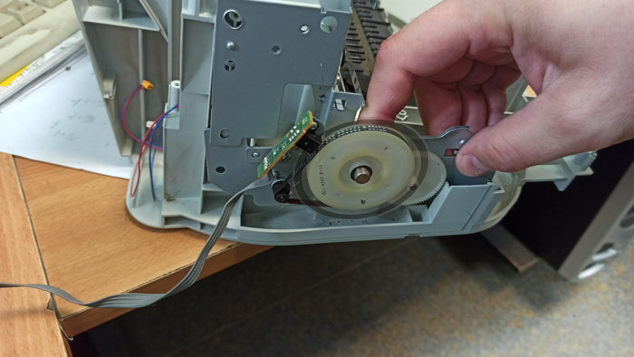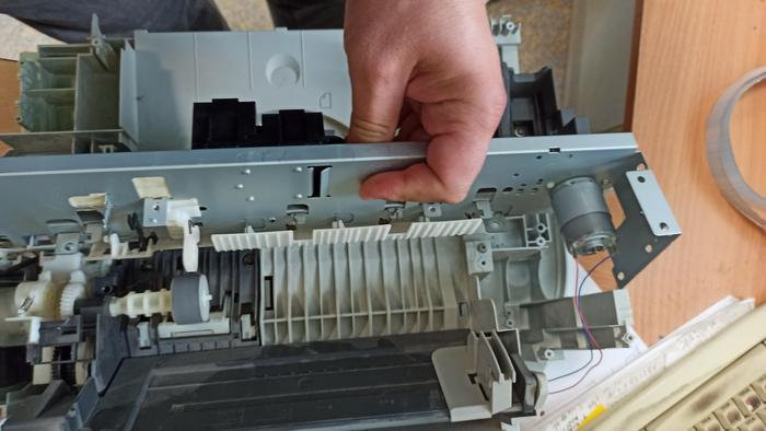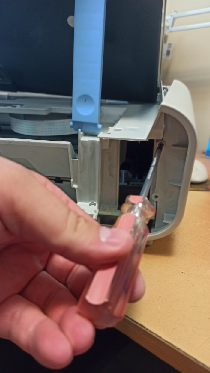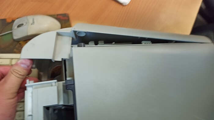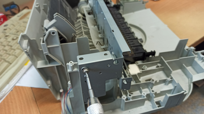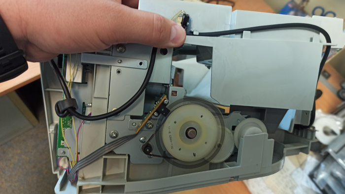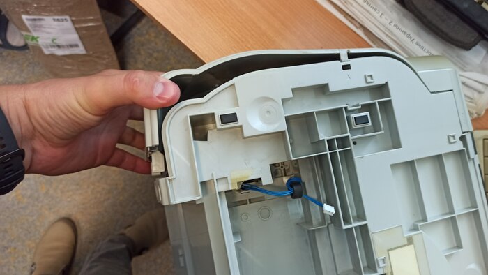 Под ней саморезы, откручиваю их. Теперь боковые крышки снимаю и верхняя крышка со сканирующей частью висит на проводах, клеммы отстёгиваю, коричневый провод массы, прикрученный к металлической раме внутри - тоже откручиваю, плоские белые шлейфы цинично сдёргиваю. На фото это не попало, фотки битые((