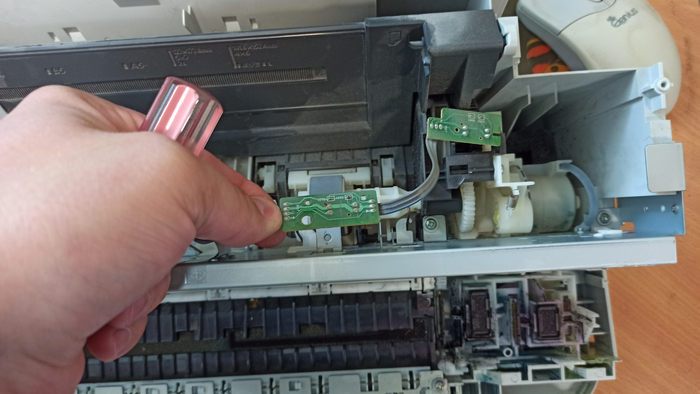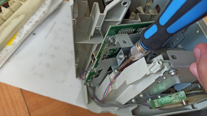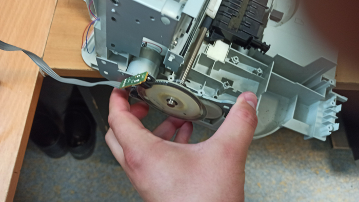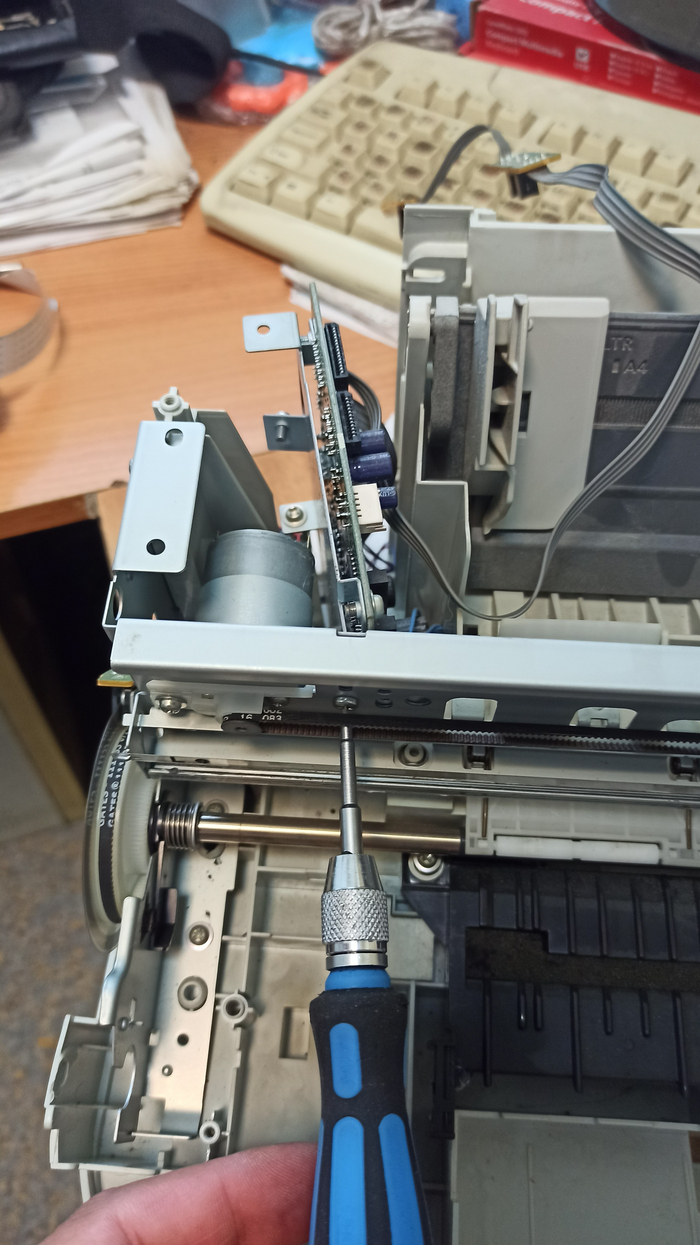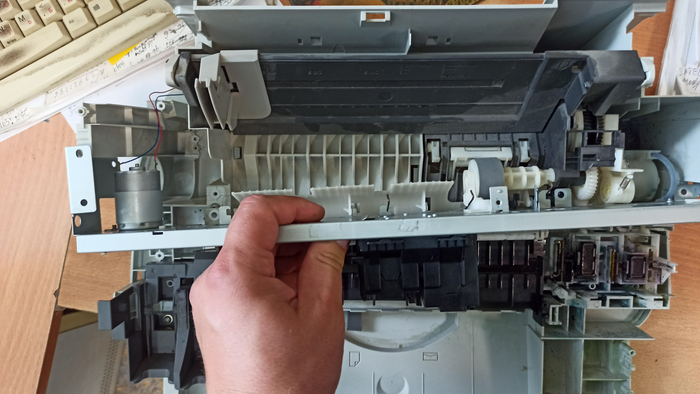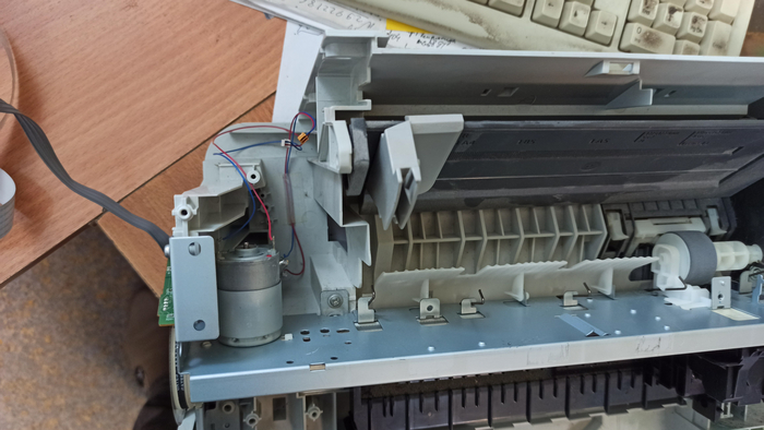 Приведу пример разбора бывшего в употреблении струйного мфу. Принтер я купил через авито, продавец расстался с ним за 150 рублей. Принтер покупался как источник ништяков запчастей при постройке 3д принтера из хлама. В самом начале разбора я извлёк из него импульстный блок питания на 24 Вольта 1.2 А максимум тока. Извлёк и подарил коллеге на работе, ибо после предыдущих разборок у меня ещё 2 бп валяются без дела. Так же из принтера была подарена всё тому же коллеге управляющая плата, но на ней кроме дросселей, операционника LM324, электролитических конденсаторов и прочей мелочевки ничего особо интересного для меня не было. Плата Основана на клоне процессора 80086, так что на неё ещё имеется оперативная память, флеш память, но они мне пока неинтересны, применить их мне некуда.