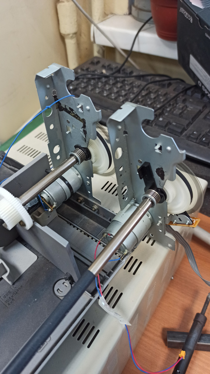 Сама рама с кареткой печатающей головки имеет люфт, и перемещается с ощутимым трением, так что её логично катать на подшипниках, и с таким слабым моторчиком не факт что удастся получить высокие скорости перемещения, да и точное разрешение энкодерной ленты пока под вопросом.