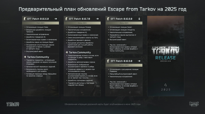 🎯 Глава студии Никита Буянов в рамках Tarkov TV представил дорожную карту на ближайшие месяцы. Полноценный релиз игры запланирован до конца 2025 года — спустя 8 лет после начала бета-тестирования.