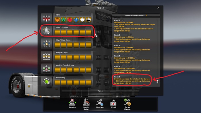 Но прокачивать можно не только свою компанию, но и своего персонажа. За каждый доставленный груз нам начисляются не только деньги, но и очки опыта. Когда мы набираем определённое количество очков, уровень водителя повышается. За каждое повышение уровня нам даются очки навыков - с их помощью и происходит прокачка водителя. Очки мы можем распределять между шестью категориями: