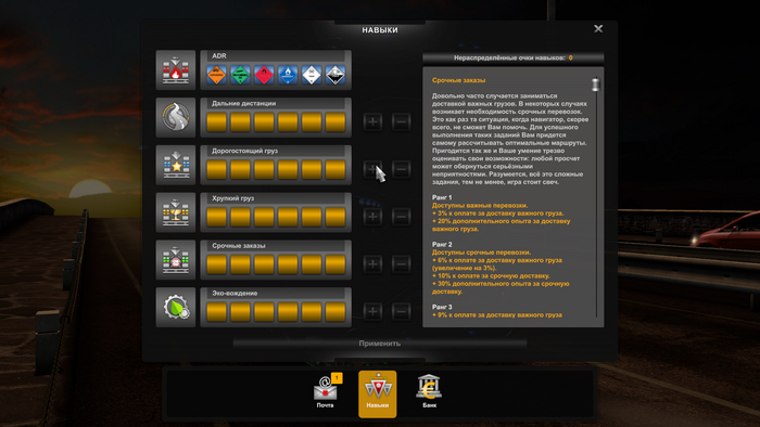 Дорогостоящие и хрупкие грузы, срочные заказы: Повышение уровней в этой категории открывает доступ к заказам с высокой стоимостью и особыми требованиями, увеличивая наш доход и сложность перевозок.