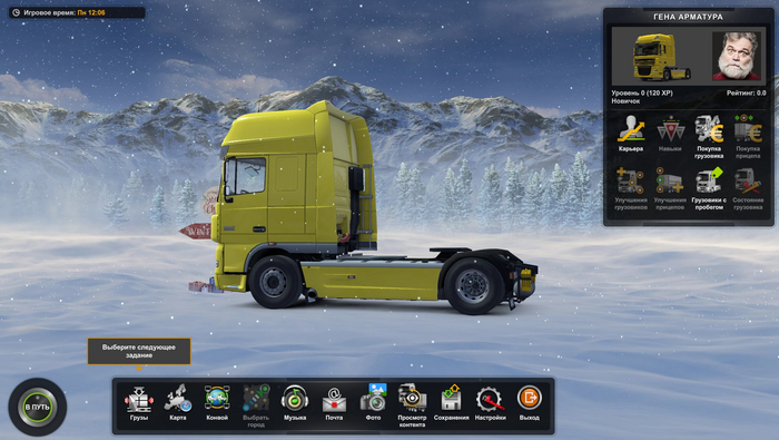 После создания персонажа, мы попадаем на ознакомительный проезд в игровом мире. На этом этапе нас просят пройти несколько километров от одного склада до другого, используя выбранный грузовик. По завершении этого этапа нам предоставляется наш первый гараж