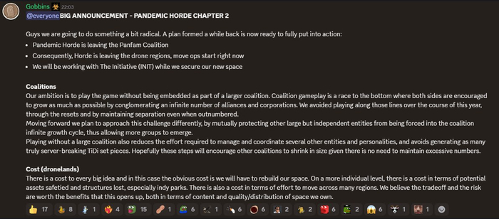 В EVE Online сейчас происходит распад одного из крупнейших блоков - коалиции Panfam, основу которого составлял Pandemic Horde. Численность коалиции составляет несколько тысяч возможно даже десятков реальных игроков