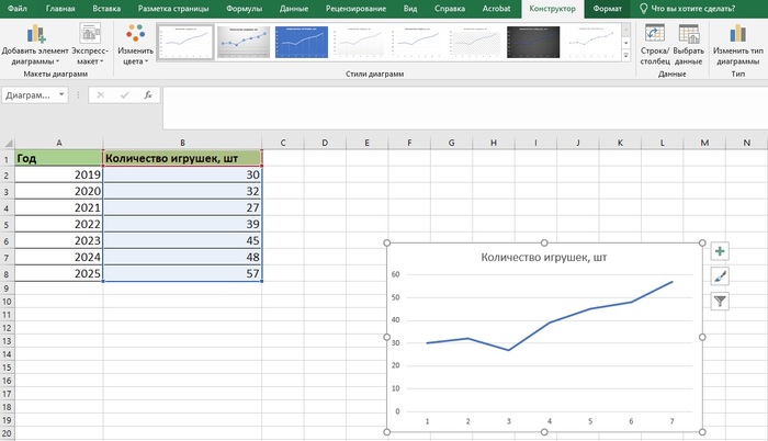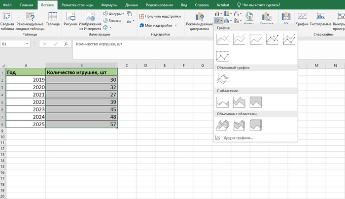 А теперь отобразим это с помощью графика. Для этого выделите столбец с переменным значением — количеством игрушек. Затем кликните «Вставка» на панели задач и выберите один из графиков.